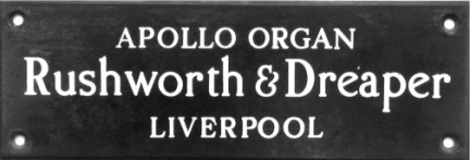 The Organ nameplate attached to the organ above the swell manual. Their range of large 2mp reed organs and other instruments, Rushworth & Dreaper called "Apollo". This Organ was built in June of 1938. |