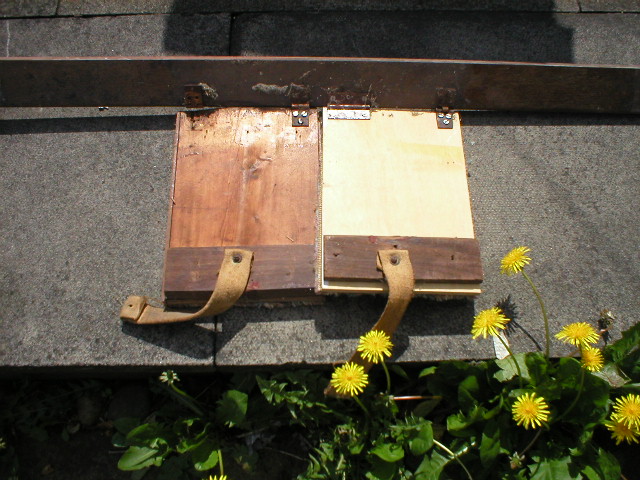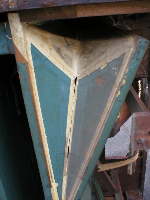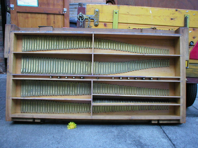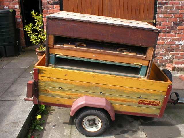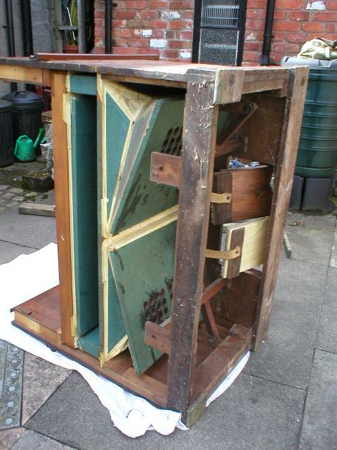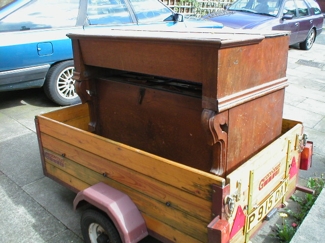 Some more pictures of my Hillier during moving on 2/5/08. This is a full 4:5 rank instrument which had languished in a garage in Heaton Chapel for around 20 years, but clearly part of family life before that and bearing the scars of a number of minor repairs and childrens' musical activities. I bought it from Alan Roking via e-Bay, its previous 100-year history is not known. Unfortunately the case, especially the lid, has been very badly treated as some time, but the internal workings are much better than expected.