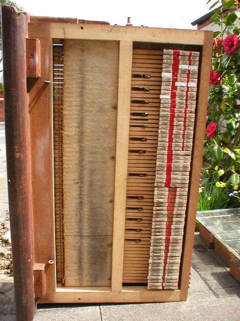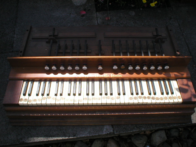 A very neat stop rail with the name of "Hillier Organ Co. London" and keyboard by H.Brooks and Co., so very English. But look at all those stuck-on labels to help the children learn to play! I don't mind, at least they enjoyed it. The keys are celluloid and two have small chips and one is scratched.