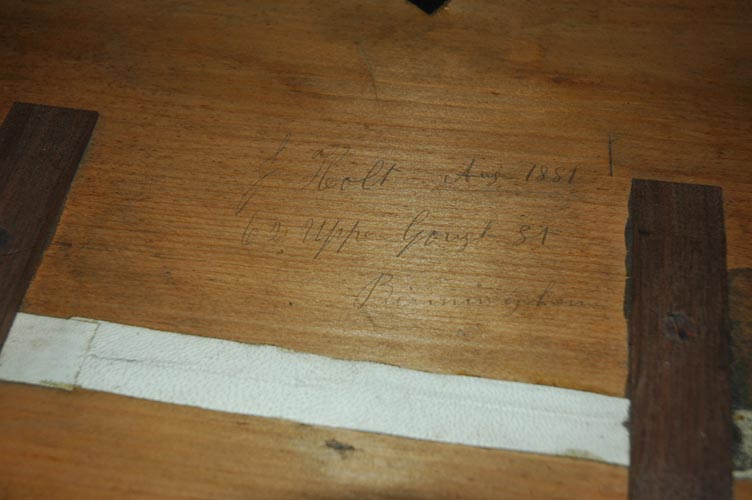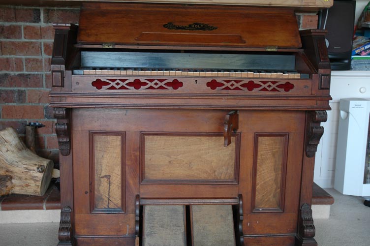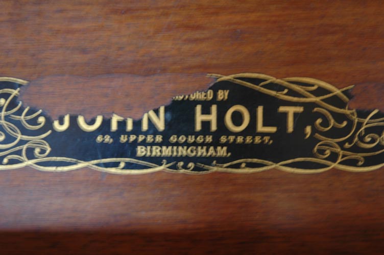During autumn of 2008 Liz Domett and I did some research on this very early Holt reed organ. Liz lives in New Zealand and having bought it recently was interested to know more of its history. It is clearly inscribed "J. Holt Aug 1881 62 Upper Gough St. Birmingham".