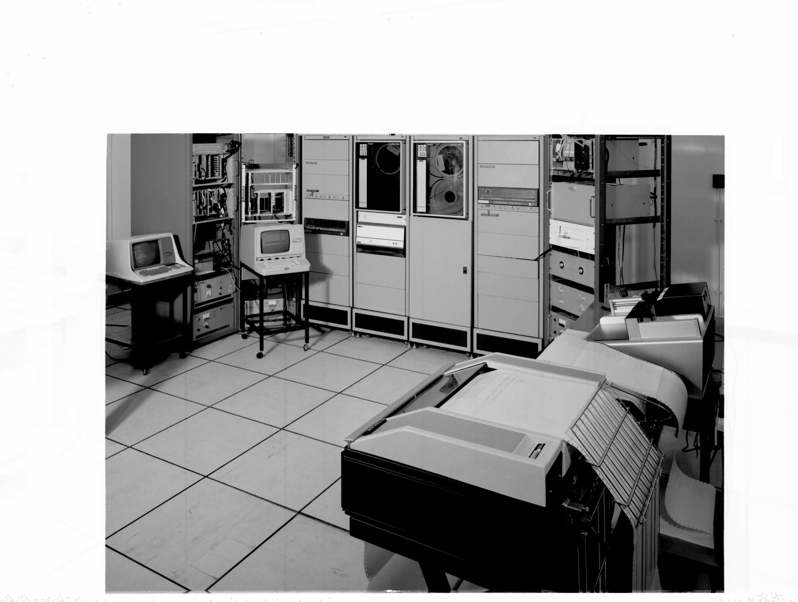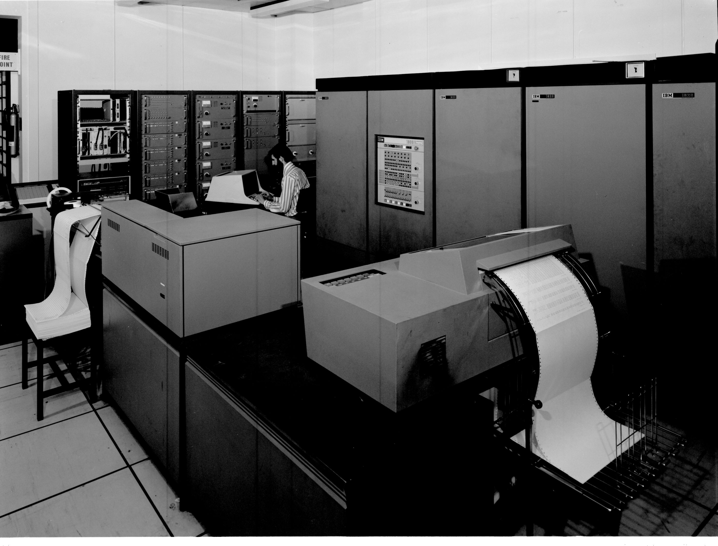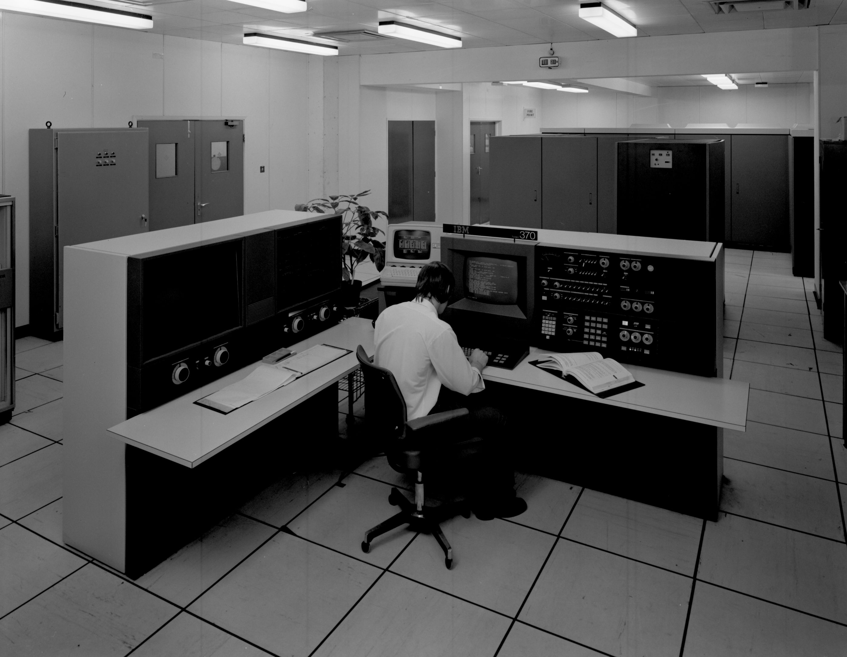 - IBM 370/165 console date? Also seen are microfiche viewers for reading OS source code.